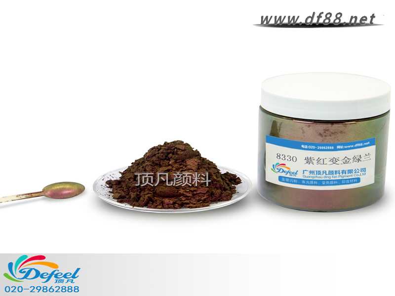 8330 紫紅變金綠藍變色龍粉可應(yīng)用于涂料、油墨、塑料各產(chǎn)業(yè),產(chǎn)品之設(shè)計大多以室內(nèi)(無紫外光之環(huán)境)與室外(有紫外光之環(huán)境)有顏色變化為訴求。